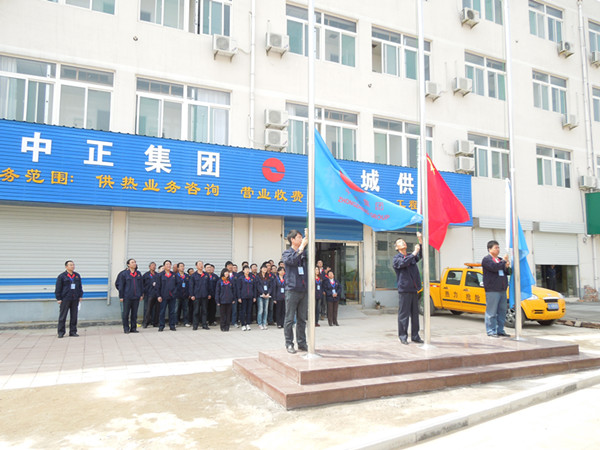 2012年4月28日,泰安市中正東城供熱有限公司辦公場所喬遷,現(xiàn)場進行了隆重的首次升國旗、司旗儀式。集團公司領(lǐng)導到場祝賀并對其現(xiàn)場環(huán)境整治情況進行了檢查驗收。